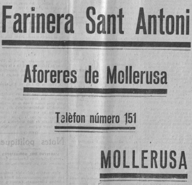 Publicitat en l’exemplar de la Veu de Catalunya es tracta de l’empresa “Farinera sant Antoni” que es tractava d’un molí de la qual avui dia encara en queden restes de l’edifici i del salt de l’aigua La Veu de Catalunya 9/09/1926.Fotografia Biblioteca de Catalunya