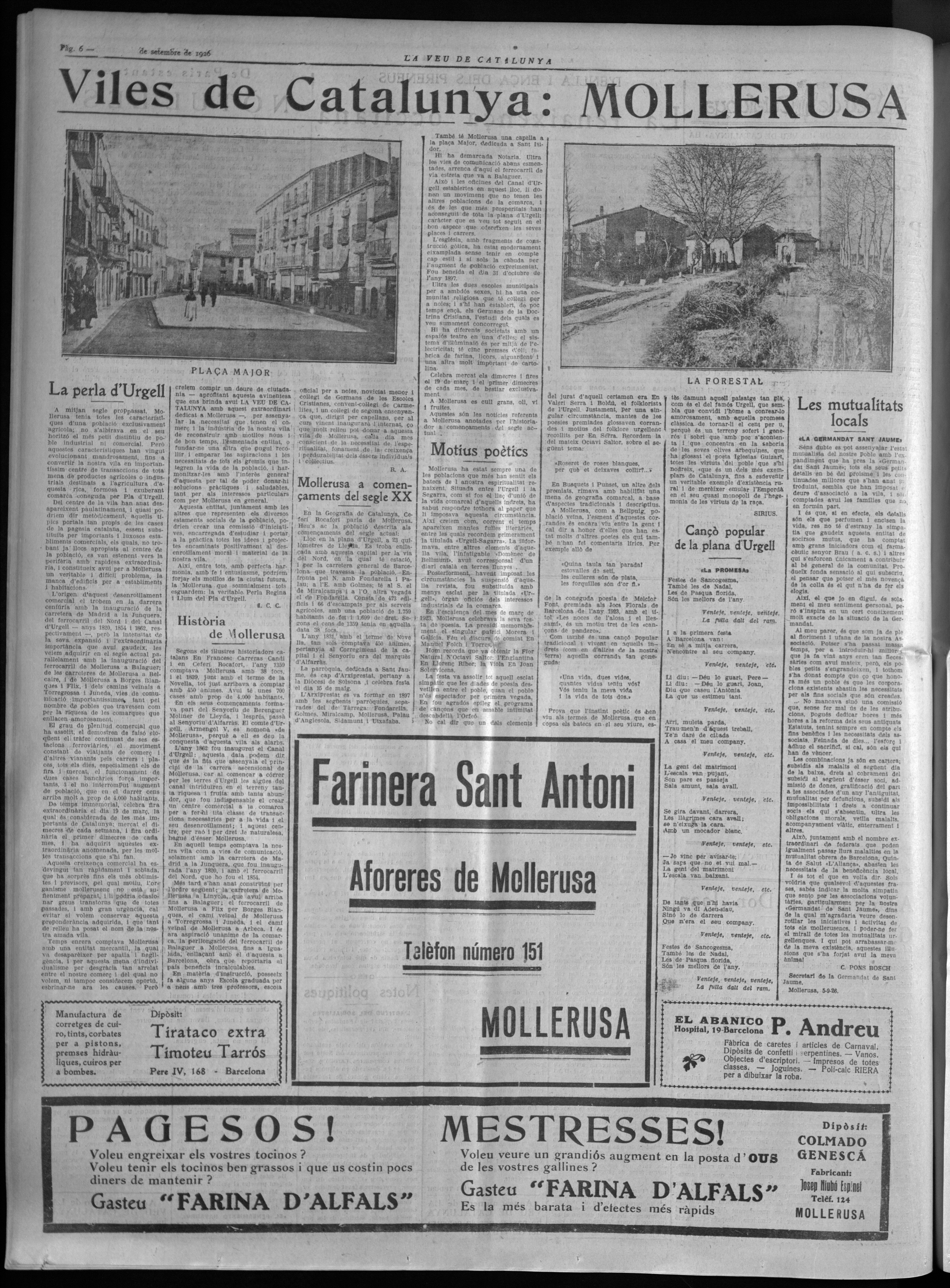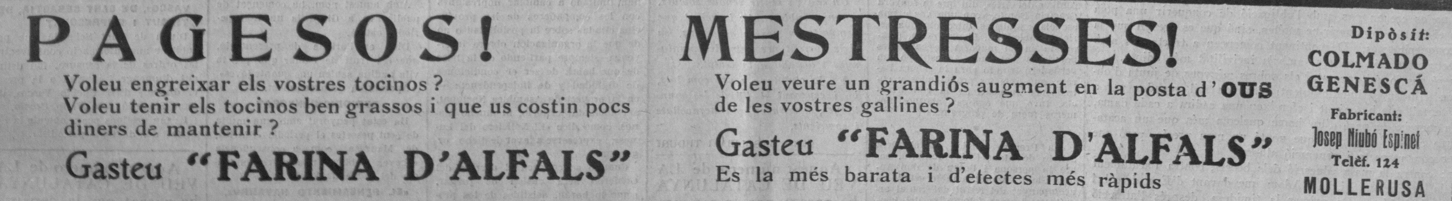 Una altra empresa, aquest cop és “Genescà” venent farina per als ramaders i a més, mestresses de casa. La Veu de Catalunya 9/09/1926.