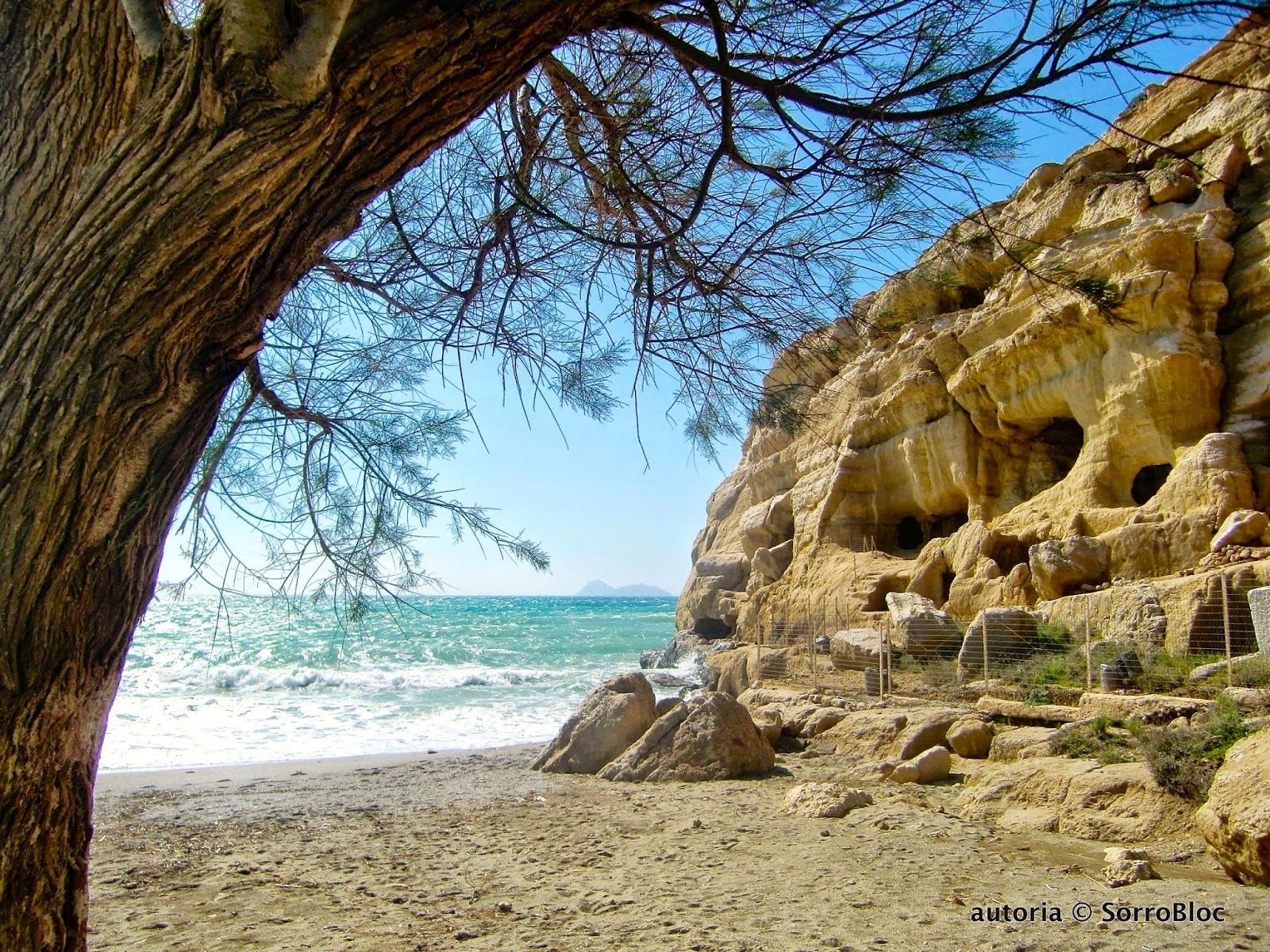 Un cop acabades les visites als tres conjunts arqueològics, ens dirigim cap a la costa, a la localitat de Mátala, per dinar en un bonic restaurant amb vistes a la platja i a les coves artificials excavades als penya-segats de la badia, que foren un antic cementiri romà.