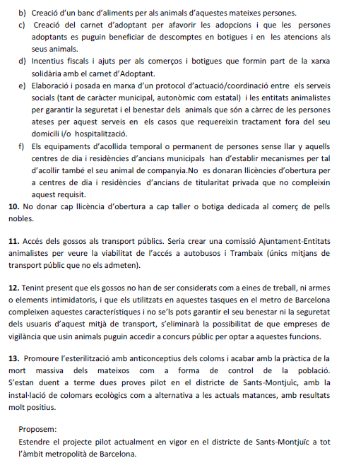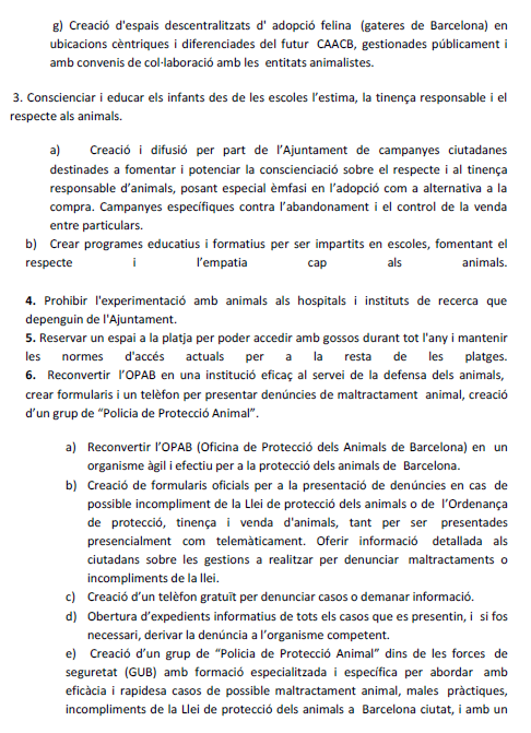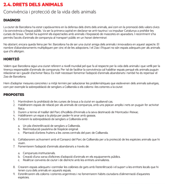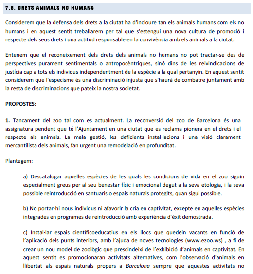 Poden descarregar el seu programa electoral complet des d’aquí. Si ho fan, dins el capítol 7, “Exclusió en la ciutat capitalista i justícia social”, apartat 7.8, “Drets animals no humans”, es trobaran això: