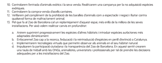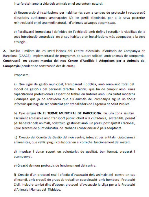 En fi, tot i desitjar propostes més agosarades, és just destacar per exemple la ferma voluntat d’impedir “en qualsevol cas” que retornin les curses de braus a Barcelona, el compromís amb el foment d’adopcions d’animals abandonats, el “vetllar” perquè no se celebrin baralles d’animals i per evitar qualsevol maltractament animal (tot i no especificar com s’organitzaria aquesta vetlla) i per últim les propostes que tenen per al zoo, una mica massa toves, però força detallades.