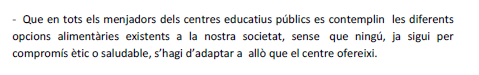 - La proposta de contemplar les diferents opcions alimentàries existents en els menjadors de tots els centres educatius públics.