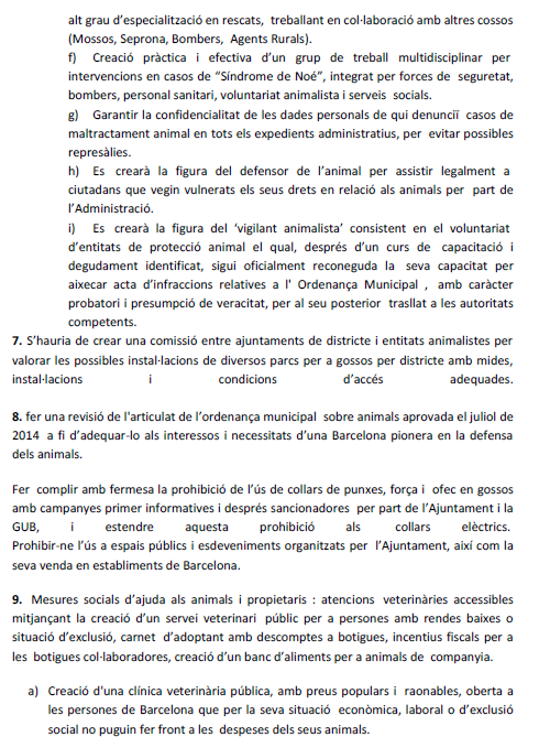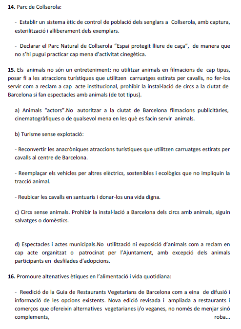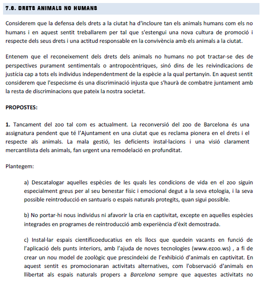 Poden descarregar el seu programa electoral complet des d’aquí. Si ho fan, dins el capítol 7, “Exclusió en la ciutat capitalista i justícia social”, apartat 7.8, “Drets animals no humans”, es trobaran això: