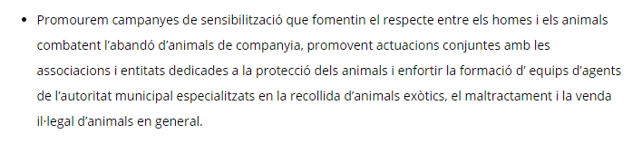 Jutgin vostès mateixos. A mi en general em sembla molt vague, poc concret, poc directe i en definitiva poc valent. L’únic que en destacaria, per destacar-ne alguna cosa, és això d’intensificar les campanyes d’adopció d’animals.