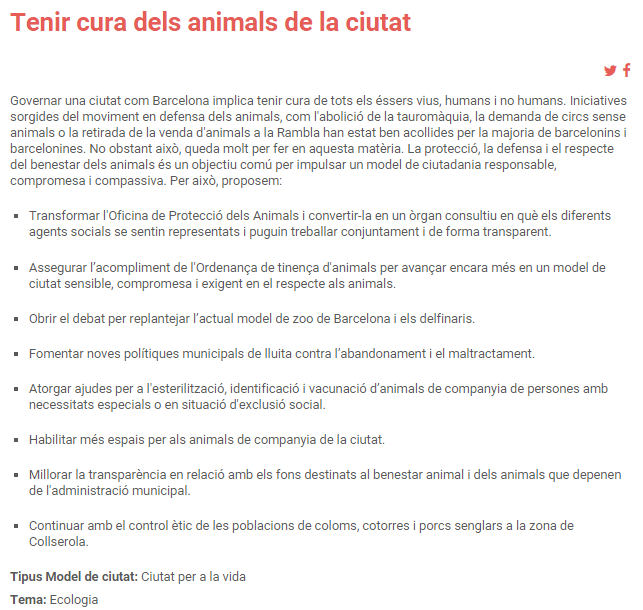No he trobat cap versió descarregable del seu programa electoral, però sembla que el tenen tot penjat i categoritzat al web oficial. Als drets dels animals hi dediquen un apartat dins el “tema” d’Ecologia i amb el títol “Tenir cura dels animals de ciutat”. És el següent: