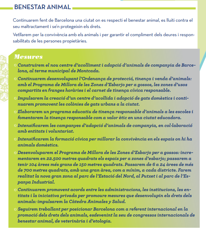 El contingut és prou sucós. S’enorgulleixen de l’abolició de la tauromàquia i de la prohibició de vendre animals a la Rambla, i a més admeten que encara queda molt per avançar en aquesta matèria. Bon senyal.