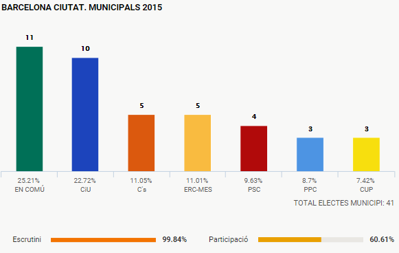 Estic content. Podria estar-ho més? Doncs sí, sempre —o gairebé— podríem estar més contents amb el món que ens envolta. Jo els explicava fa uns dies que volia un Ajuntament de Barcelona independentista, d’esquerres i compromès a defensar al màxim els drets dels animals. Doncs bé, almenys he vist acomplert un dels meus tres requisits: la dreta no governarà Barcelona. Podria ser millor? Sí, és clar, podria ser que BCN en Comú fos tan independentista i tan antiespecista com la CUP. Però tot i no ser independentista, almenys ahir la senyora Colau va deixar ben clar que Catalunya ha de poder decidir lliurement quina ha de ser la seva relació amb Espanya. I pel que fa als drets dels animals, el programa de BCN en Comú no era tan agosarat com el de la CUP —ni tan sols com el d’ERC— però tampoc era tan indigne com el del PSC, ni tan ambigu com el de CiU. Tindrem, doncs, una alcaldessa força d’esquerres, força compromesa amb el dret a decidir i mínimament decent en la defensa del dret animal. Per acabar-ho d’adobar, la CUP irromp al consistori amb 3 regidors, l’unionisme anti-autodeterminació (C’s+PSC+PP) cau des dels 20 fins als 12 regidors, el suport al dret a decidir (BComú+CiU+ERC+CUP) puja dels 16 regidors fins als 29, i els regidors d’esquerres i netament independentistes (ERC+CUP) augmenten des dels 2 fins als 8. A més, si deixem de banda “l’eix nacional”, ens trobem que el consistori barceloní passarà de 13 regidors d’esquerres a tenir-ne 23 (BComú+ERC+PSC+CUP) i que la dreta, per contra, passa de tenir-ne 23 a tenir-ne 18 (CiU+C’s+PP). Bons resultats a Barcelona per a l’esquerra i per al sobiranisme, es miri per on es miri. Mals resultats per a la dreta i particularment dolents per a la dreta espanyolista, es miri per on es miri.