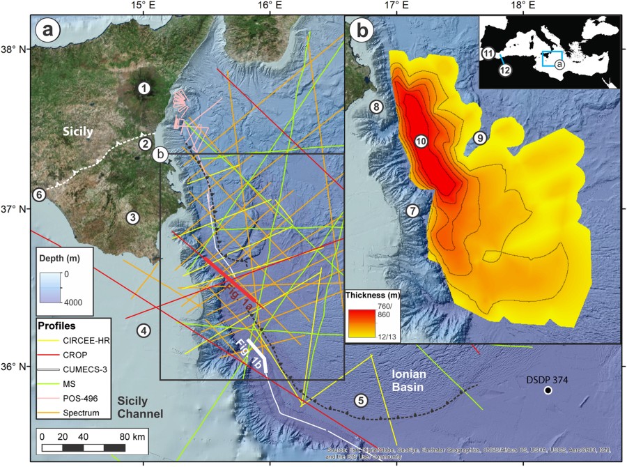 L’actual Canal de Sicília, que separa l’illa del continent africà, era obturat durant la MSC. Les dades sísmiques i les perforacions de sediments han permès Micallef et al. de compilar la base de dades geofísica més completa de la vora occidental de la Conca Jònica: