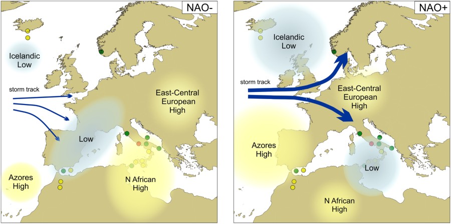 L’Oscil·lació Nord-Atlàntica (NAO) consisteix en fluctuacions en la diferència entre la pressió atmosfèrica a nivell del mar entre les baixes pressions d’Islàndia i les altres pressions de les Açores. En períodes de domini de NAO negatiu, les tempestes nord-atlàntiques que arriben a Europa són més fluixes. Quan el NAO és positiu, les tempestes són més elevades. En aquest esquema Di Rita et al. proven d’estendre aquesta explicació a les diferents respostes que fan la Mediterrània Occidental i la Mediterrània Central a la NAO. La NAO positiva consisteix en períodes relativament humits a la Mediterrània Central, i eixuts a la Mediterrània Occidental.