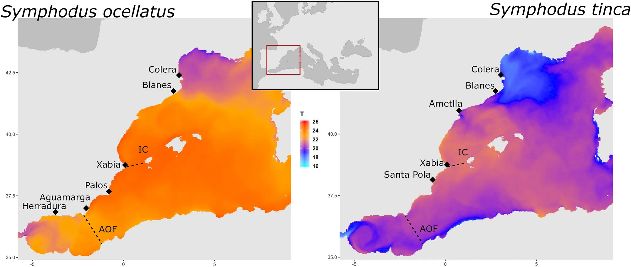 El gènere Symphodus (Rafinesque, 1810) pertany a l’ordre dels Perciformes i a la família dels làbrids. A la Mediterrània Occidental, hi trobem diferents espècies d’aquest gènere, entre elles Symphodus ocellatus (Forsskål, 1775) i Symphodus tinca (Linnaeus, 1758), que reben noms populars com el de llavió o tord lloro. Quan dues espècies comparteixen una mateix àmbit geogràfic hom diu que són “simpàtrides”, en contrast amb els espècie “alopàtrides”, que tenen àrees de distribució diferents. Les espècies simpàtrides permeten fer estudis comparatius sobre com l’adaptació i la connectivitat locals influeixen en l’estructura genètica de la població. Héctor Torrado Mateo, del Centre d’Estudis Avançats de Blanes, ha triat aquestes dues espècies en el marc del seu treball de doctorat. La tesi de Torrado tracta de les diferències genòmiques associades a l’alta mortalitat que té lloc en la franja d’edat que fa la transició entre els juvenils demersals i els adults litorals. Una part d’aquesta feina apareix ara en forma d’article a la revista Scientific Reports. Torrado et al. han combinat dades individuals de lectures d’otolits amb genotipatge per seqüenciació. Mentre que l’estructura de població de S. ocellatus presenta una gran diferenciació per gradient geogràfic seguint fronts oceanogràfics, en S. tinca la diferenciació és molt menor. Totes dues espècies presenten regions genòmiques marcades per l’adaptació local, en particular a la temperatura, però si en S. ocellatus aquesta adaptació s’associa amb la productivitat, en S. tinca té més rellevància la turbulència.