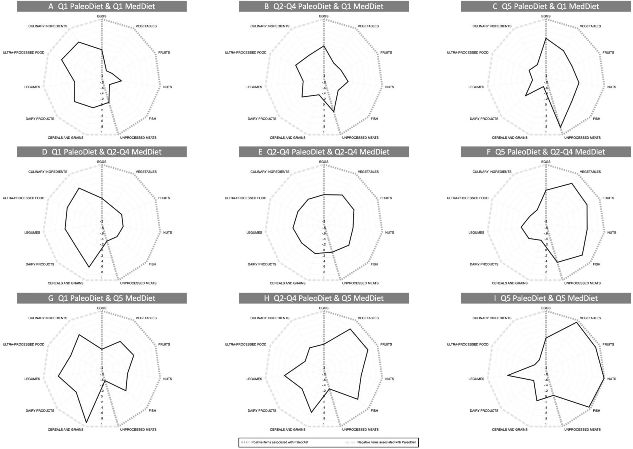 La puntuació de seguiment de la “paleodieta” es fonamenta en els sis grups promoguts (fruita, fruit sec, verdura, ou, carn i peix) i els cinc grups desencoratjats (cereals i grans, productes làctics, llegums, additius alimentaris i aliments processats). Els participants eren categoritzats per a cada grup alimentari en quintils segons la posició que ocupaven en el rang de freqüències. La suma dels onze grups deixa un ventall de puntuació d’adhesió a la paleodieta d’11 a 55.