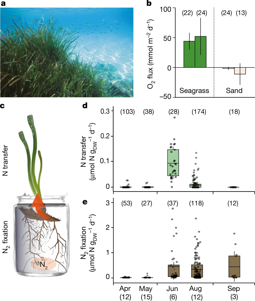 Prats de posidònia en sediments sorrencs de la Badia Fetovaia, a l’illa d’Elba (a), mostren fluxos aeris nets d’oxigen que contrasten amb els entorns sense prat (b). En aquests prats és possible detectar la fixació de nitrogen en un sistema d’incubació (c). La fixació de nitrogen la realitza un simbiont en les arrels (e) des d’on es transfereix a les fulles (d).