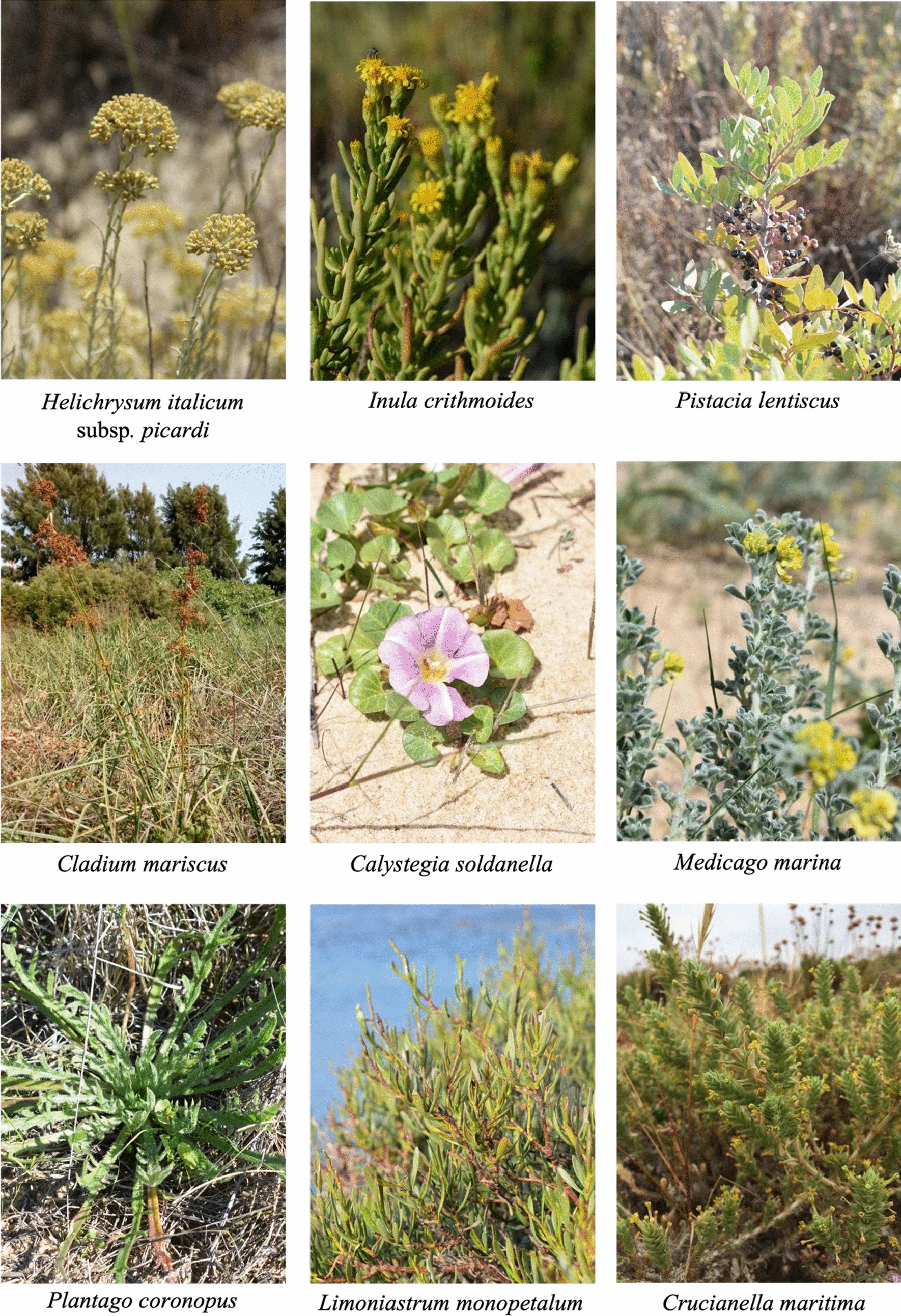 D’acord amb criteris etnofarmacològics, de contingut fenòlic i de disponibilitat, Oliveira et al. seleccionaren nou espècies: el llentiscle (Pistacia lentiscus L., de la família de les Anacardiacea), la xisca borda (Cladium mariscus (L.) Pohl, de la família de les Cyperaceae), la salsona (Inula crithmoides L., de la família de les Asteraceae), la perpètua de les arenes (Helichrysum italicum (Roth) G. Don subsp. picardi (Boiss. & Reut.) Franco, de la família de les Asteraceae), la campaneta de mar (Calystegia soldanella (L.) R. Br., de la família de les Convolculaceae), el carretó de platja (Medicago marina L. de la família de les Fabaceae), la cervina (Plantago coronopus L., de la família de les Plantaginaceae), l’ajocagripaus (Limoniastrum monopetalum (L.) Boiss., de la família de les Plumbaginaceae) i la crucianel·la (Crucianella marítima L., de la família de les Rubiaceae). Plantes d’aquestes espècies foren recollides en quatre districtes de la regió costanera de l’Algarve entre el 2017 i el 2018, previ permís de l’Instituto da Conservação da Natureza e das Florestas (ICNF). Custódio feia la identificació de l’espècie. Després de collir-les, les mostres eren conduïdes al laboratori, on les rentaven, les congelaven a -20 °C, les assecaven en un Lyoalfa 15 durant tres dies, i les trituraven en un molí Retsch PM 100. Una fracció del material recollit fou conservat en l’herbari del grup XtremeBio.