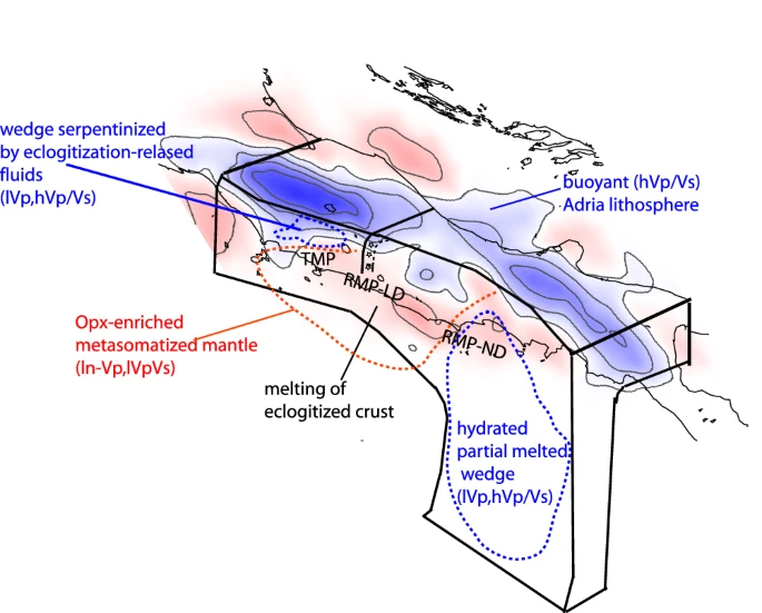 La litosfera d’Adria i la falca Tirrènica de mantell que hi contacta es caracteritzarien, doncs, per anomalies de composició. Aquests heterogeneïtats s’associarien a un procés diacrònic i irregular de subducció continental i a peculiaritats en el magmatisme.