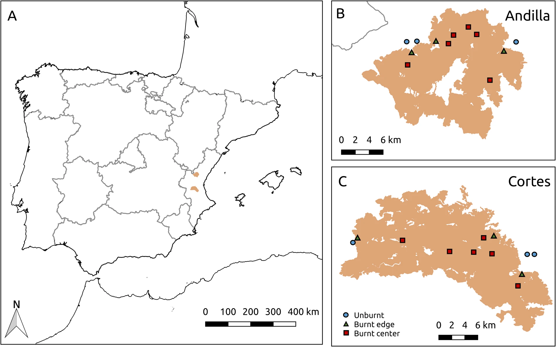 Mapes dels megafocs d’Andilla i de Cortes del juny i juliol del 2012. S’hi indiquen les localitzacions de les parcel·les estudiades per Pausas et al.