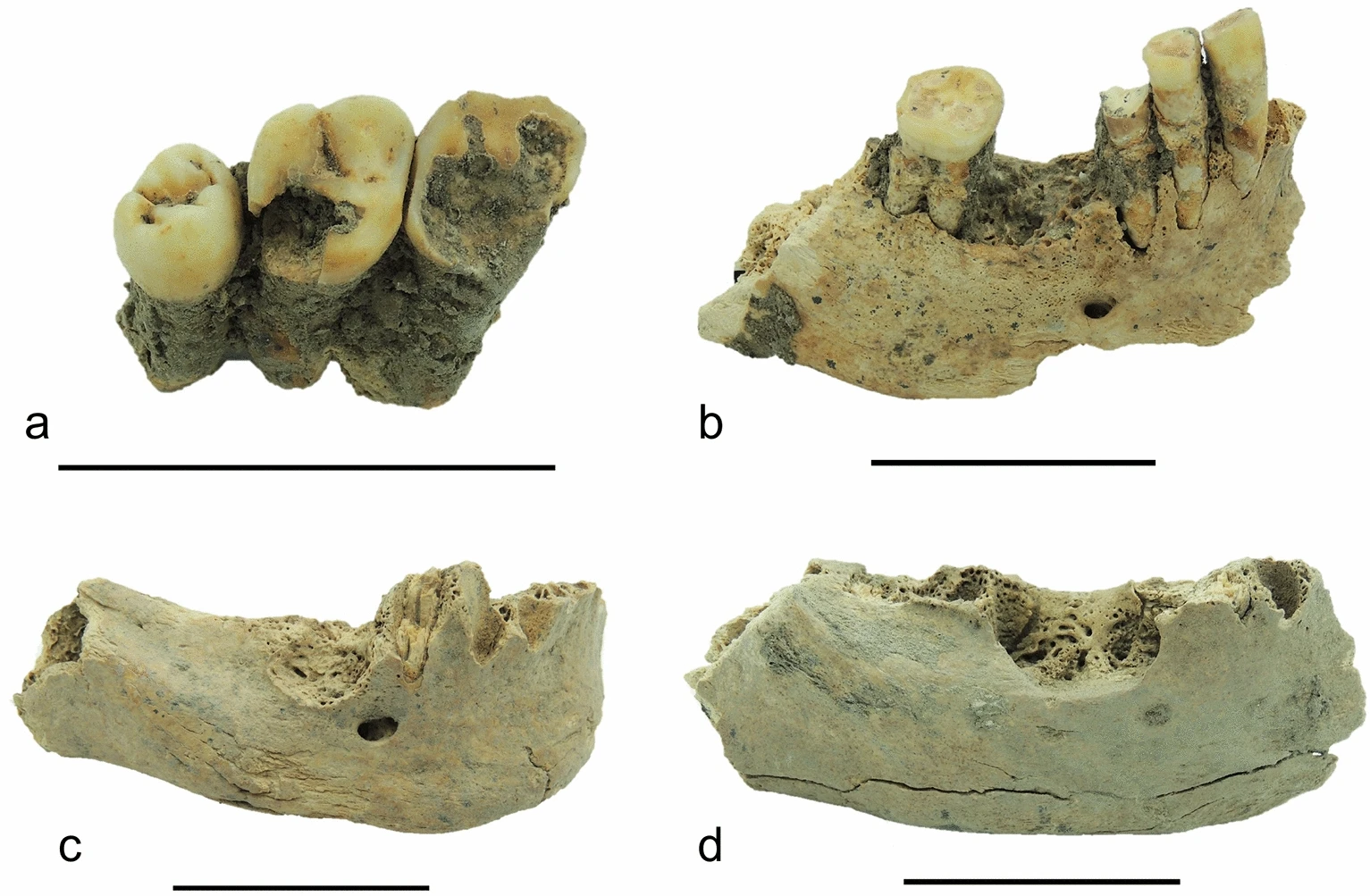 Capasso et al. han estudiat patologies dentoalveolars de restes humanes de fa més de quatre mil anys de Mahal Teglinos. Així han observat caries (a), pèrdua de molars (b) i abscessos (c i d).