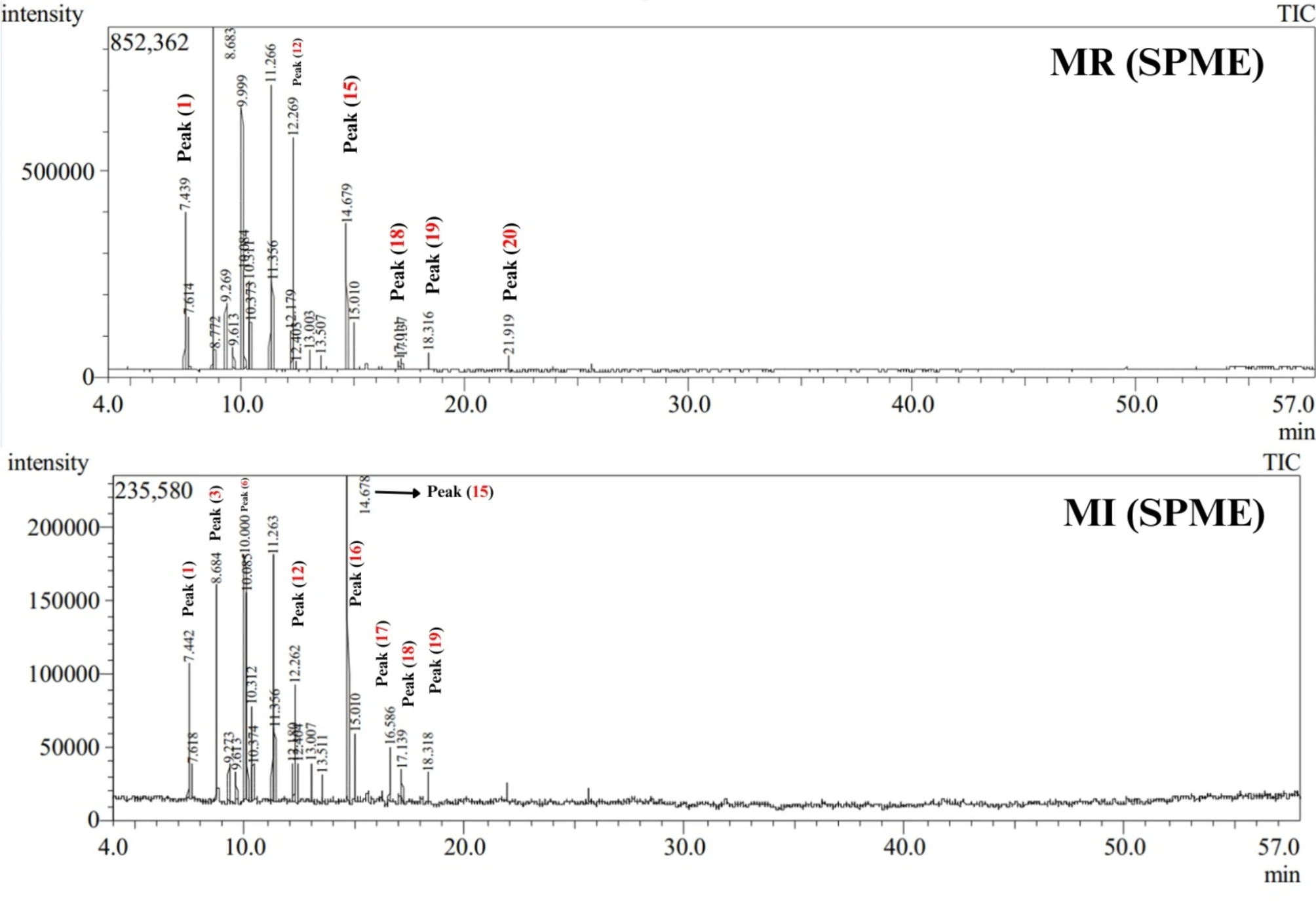 Les mostres comercials de marduix esmentades, MR i MI, foren analitzades per Abouelela et al. amb una HS-SPME acoblada a GC-MS. Hi trobaren un total de 20 pics, corresponents a alcohols, èsters, cetones, hidrocarburs monoterpènics, monoterpens oxigenats i hidrocarbur sesquiterpènic: