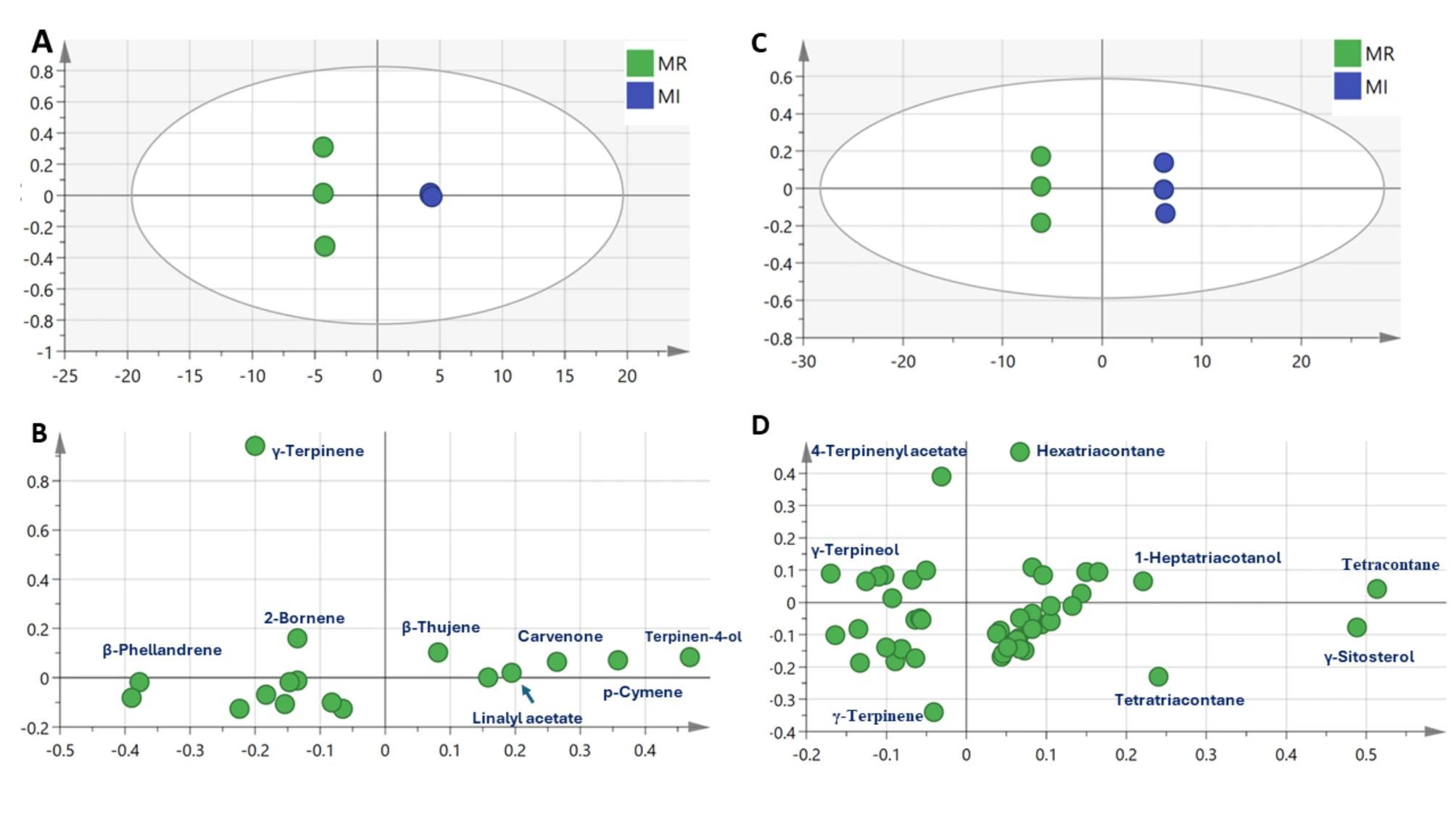 En l’extracció per HS-SPME, la PCA discrimina clarament MR i MI. Això s’explica perquè MR és més ric en γ-terpinè, β-fel·landrè, i 2-bornè. En canvi, MI és més ric en terpens oxigenats (terpinè-4-ol, carvenona i linalil-acetat). Tot plegat demostra que el mètode HS-SPME és eficient en l’avaluació de la qualitat d’extractes de marduix.