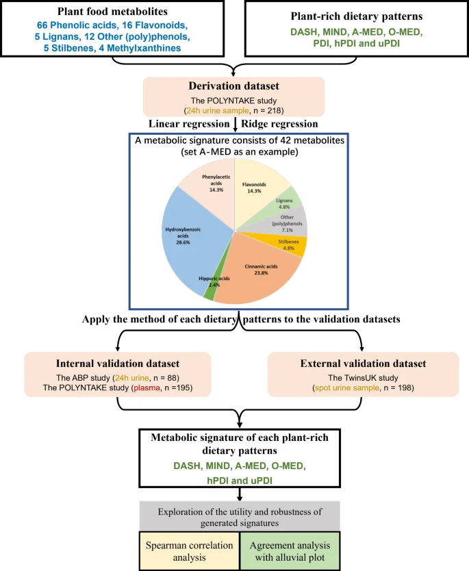 Els metabòlits analitzats consistien en 66 àcids fenòlics, 16 flavonoides, 5 lignans, 12 fenols d’altres grips, 5 estilbens i 4 metilxantines. Els patrons alimentaris eren DASH, MIND, A-MED, O-MED, PDI i hPDI i uPDI.