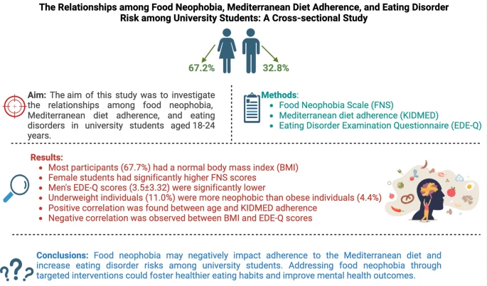 – The relationships among food neophobia, mediterranean diet adherence, and eating disorder risk among university students: a cross-sectional study. Nilufer Ozkan & Fatma Hazan Gul. J. Health Popul. Nutr. 44: 10 (2025).