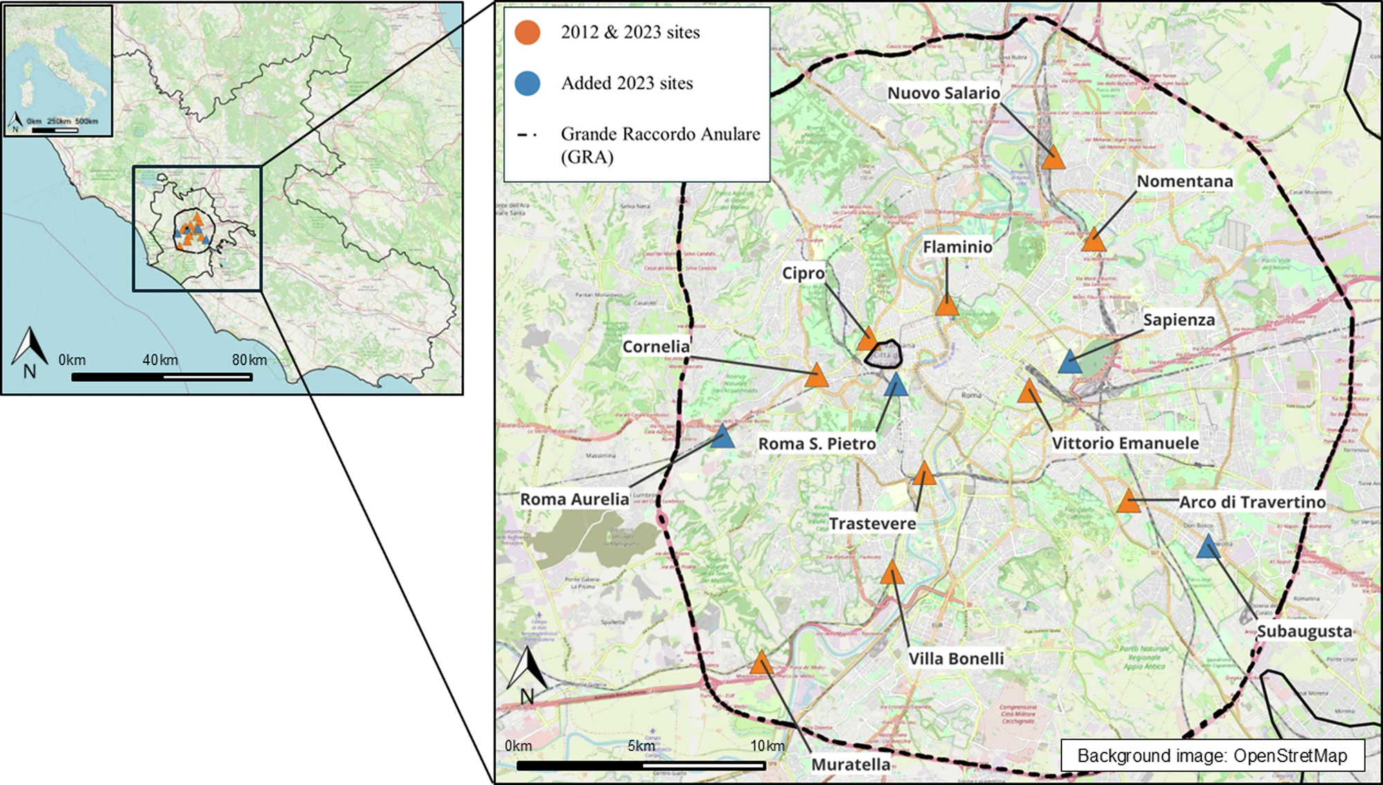 El Grande Raccordo Anulare és una autopista de 68 km de longitud que envolta l’àrea més urbanitzada de Roma. Entre el 13 d’abril i el 15 de desembre del 2023 es realitzaren monitoritzacions entomològiques en 14 localitats situades a l’interior del Grande Raccordo Anulare. En 10 d’aquestes 14 localitats es feren monitoritzacions entre el 10 de juliol i el 4 de desembre del 2012.