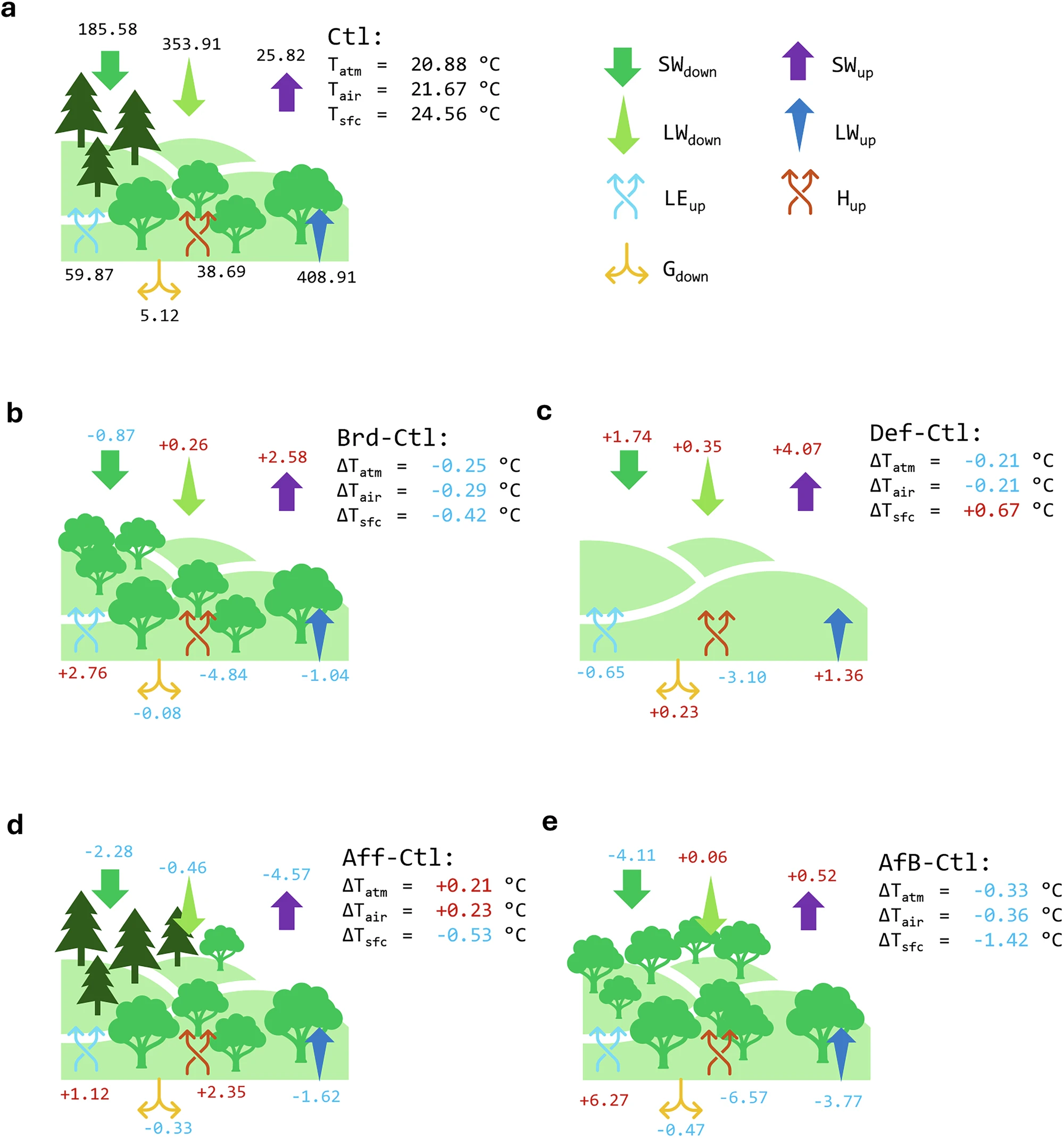 Yao et al. han simulat l’efecte sobre diferents paràmetres climàtics de deixar la regió atlàntica amb els boscos actuals (a), de convertir els boscos de coníferes en boscos planifolis (b), de desforestar (c), de forestar (d) i de combinar forestació i conversió (e).
