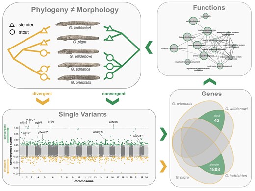 El peix porc Gouania de la família dels gobiesòcids és un endemisme mediterrani de fons de grava i còdols. Podem dir que és un gènere monoespecífic, integrat per una sola espècie, Gouania willdenowi? Ho podem dir, però llavors costa d’encabir-hi tant peixos porcs esvelts com peixos porcs corpulents. Entre aquests dos morfotips hi ha diferències en termes de longitud corporal, de compressió cefàlica, de nombre de vèrtebres, de mida d’ulls o de l’estructura del disc adhesiu. Els estudis morfogenètics han conduït a la definició de cinc espècies diferents: G. hofrichteri (esvelt), G. pigra (esvelt), G. wildenowi (corpulent), G. adriatica (corpulent) i G. orientalis (corpulent). Hom podria pensar que hi hauria una branca del gènere que hauria evolucionat cap a l’esveltesa i una altra cap a la corpulència, però les dades genètiques indiquen que G. pigra i G. willdenowi són espècies germanes, de manera que la corpulència hauria aparegut, si més no, dues vegades en aquest gènere, en G. wildenowi i, de manera independent, en l’ancestre compartit per G. adriatica i G. orientalis. Maximilian Wagner i Hannes Svardal, del Grup d’Ecologia Evolutiva de la Universiteit Antwerpen, s’han interessat per aquest gènere de peixos precisament per aquesta situació de convergència fenotípica. Com hem dit la corpulència va associada a tota una sèrie complexa de trets morfològics i comportamentuals, de manera que entendre’n la base genètica pot ajudar a il·luminar un aspecte rellevant de la biologia evolutiva. En un article a la revista de la Society for Molecular Biology and Evolution, Genome Biology and Evolution, Wagner et al. ens mostren la importància de resseguir la convergència genòmica en diferents nivells molecular per trobar indicis de processos evolutius en la seva escala temporal.
